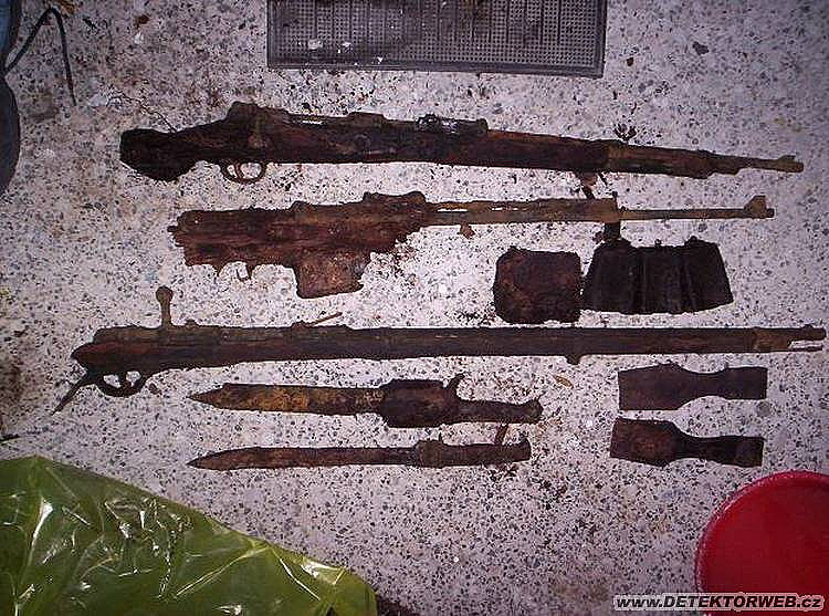 Flinty byly obalené uniformami a na konci laufů feldmizemi. Zamrzelo, že tam nebyl žádný odznak nebo přezka ani známka. Jen výzbroj. Ten starý jednoraný mauser je v daleko lepším stavu, než druhoválečné, z moderních materiálů vyrobené flinty. O kus dál se ještě povaloval nějaký revolver. Problém nastal, jak to odvézt. Tak jsme pobrali jen tři flinty a bodáky a dali se na ústup. Zbytek zůstal v díře, až pojedem znovu, tak to dovyzobem i s tím pásem. Připadal jsem si jak za starých časů, kdy se z lesa brali jen pušky se závěrem a nerozhozené pistole.