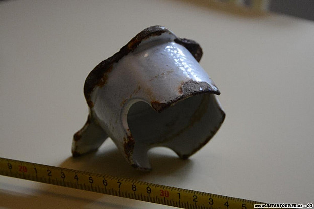 Při odkopávání zeminy kolem domu jsem narazil na tento předmět ze smaltované litiny. Netušíte, o co se může jednat? Do země se to mohlo dostat při stavbě baráku na konci 20. let, anebo při stavebních úpravách na konci 80. let. Díky předem!