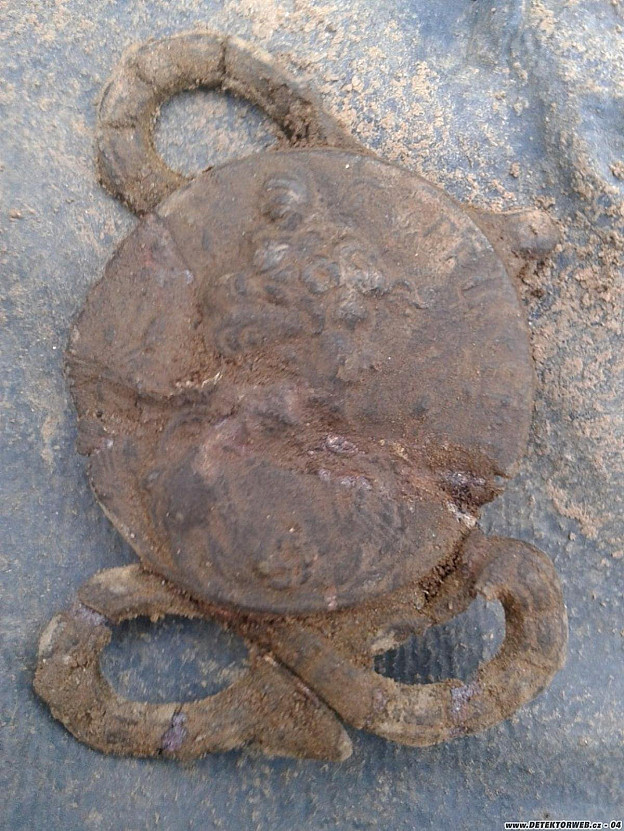 tak mi skočila pod cívku tahle zajímavá asi spona, napřed ten horní díl, říkám docela pěkná kytka, projedu cívkou ještě nad dírou a tón pokračoval, vyskočil asi pravděpodobně spodní díl spony s vyobrazením postavy, pravděpodobně ženy s drdolem a nápisem PRINTEMP, ale je to orientačně, nápis není moc vidět, ani nevím, jestli jsem sponu k sobě sestavil, jak se má a kousek chybí. Kdyby někdo věděl, o co jde, budu rád.