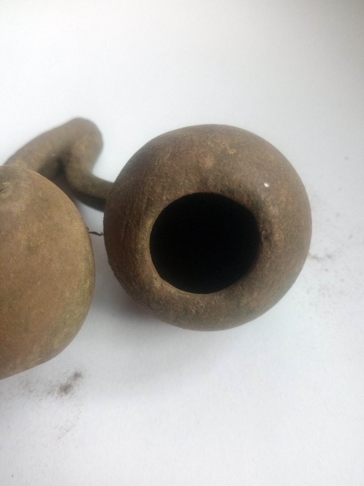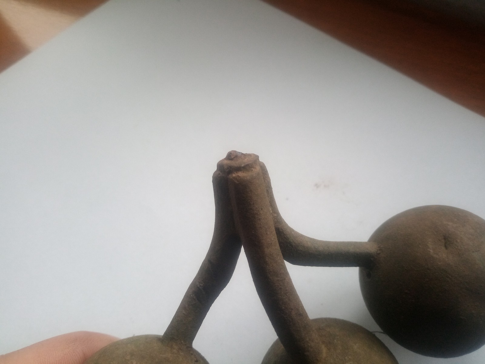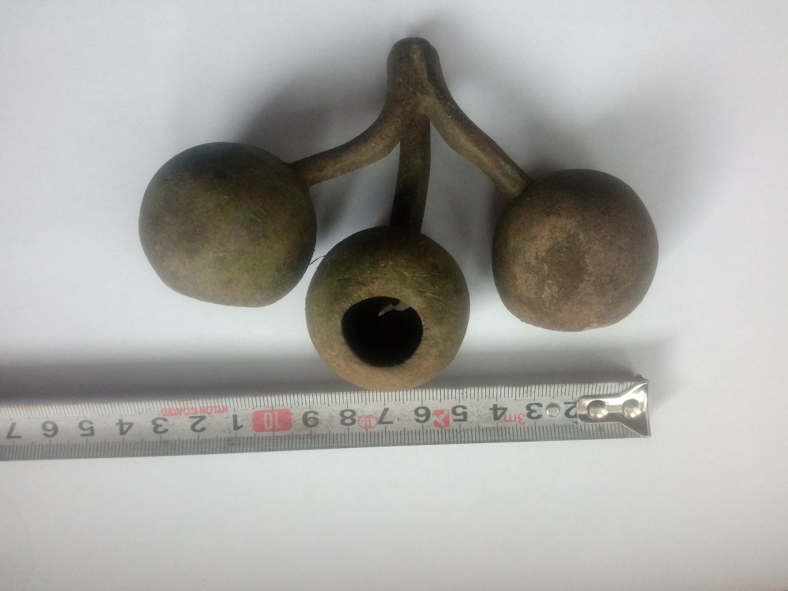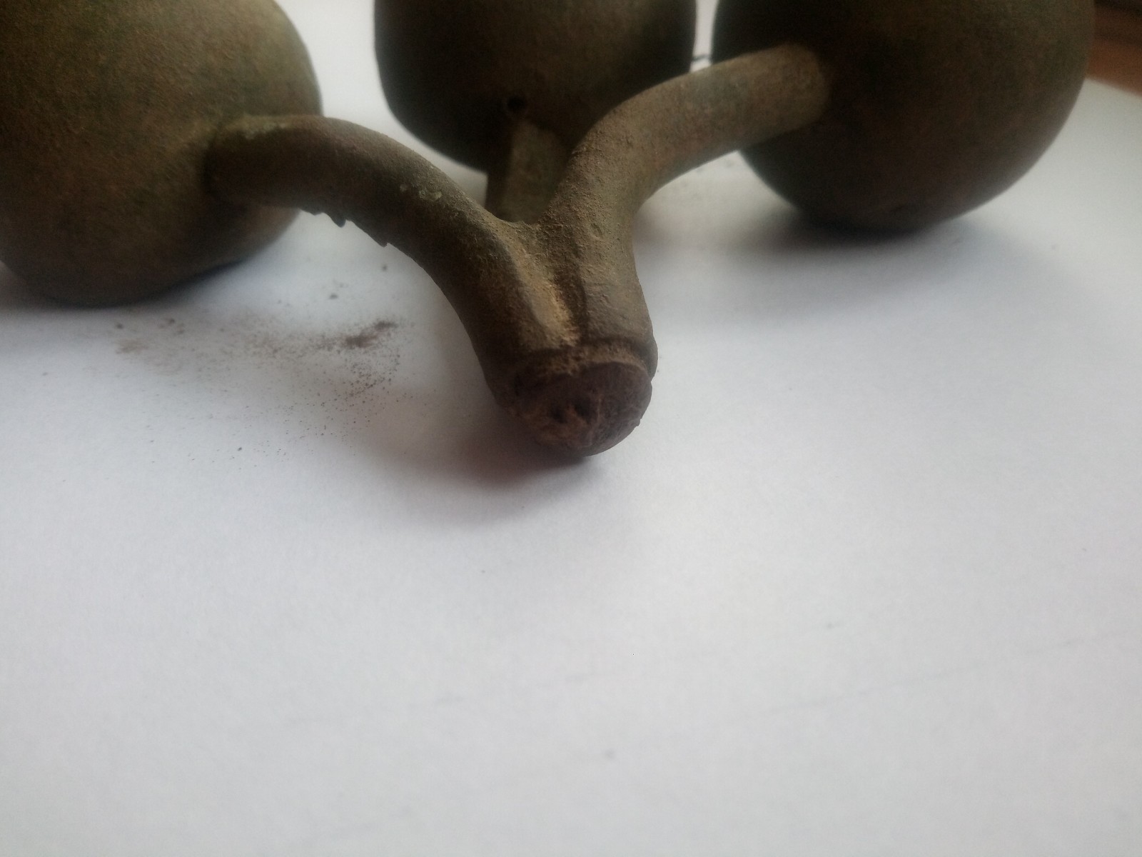 po delší době bych se zde rád obrátil s prosbou o pomoc. Nedokáži nikde zařadit tento objekt, který připomíná jakýsi rostlinný motiv. Prvně jsem měl pocit, že by mohl být bronzový, ale po odloupnuti krusty vypadá spíše jako měděný, či mosazný. Zpracováním mi tento objekt přijde spíše starší, jednak otvory nejsou úplně přesné, ale i tloušťka kulí je víc než 1 mm, při průměru cca 40 mm (je to celkem masivní a nevypadá to na nějaký výlisek). Vnitřek se mi nepodařilo nafotit a vidět je tam taky docela špatně, je tam viditelný spoj mezi kulou a stopkou, ale nepoznám jestli je to být, nebo štucek se závitem.