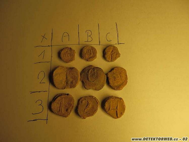 1) V naší lokolitě jsem kopnul na ploše 100 m2 těchto 9 kousků. Stejný materiál, stejná tloušťka, stejné rysy. Nejsem znalec, ale podle zesílených okrajů od ražby se domnívám, že mladé kousky to rozhodně nebudou. V rozporu je zde pouze objekt 2B. S písmenem "C" jsem minci ještě neviděl. Nepoznává někdo alespoň 1 z 9 kousků??