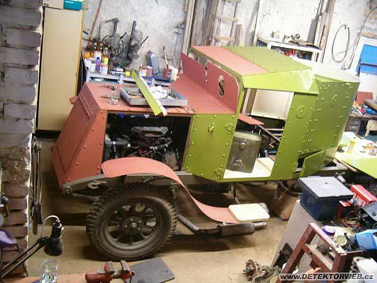 Psal se rok 1999 a jako čerstvému členu KVH, zabývajícím se čs. legiemi v 1.světové válce, se mi hlavou honily myšlenky na zpestření tehdy ještě dost obsahově chudých rekonstrukcí bitev. S kamarádem jsme tak začali kout pikle na stavbu pancéřového vozu. Tenkrát jsme se shodli pouze v tom, že by bylo dobré nějaké takové vozítko postavit. To bylo ale vše, co jsme společně dokázali. Otázka konkrétního stroje však stále jen visela ve vzduchu. Tento oříšek se mi nakonec podařilo rozlousknout díky náhodě v podobě nálezu čtyř plechových loukoťových kol v kovošr otu. Podle tvaru se kola nejlépe hodila k britskému Austinu, které se objevily na východní frontě.